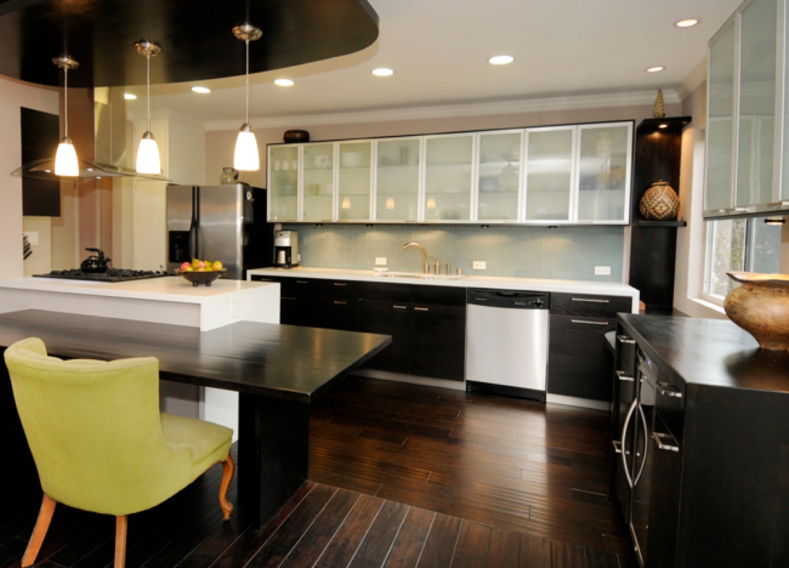 Fabricated from standardized components with custom accents, this contemporary kitchen was done on a budget yet features CaesarStone counters and glass tile backsplash.