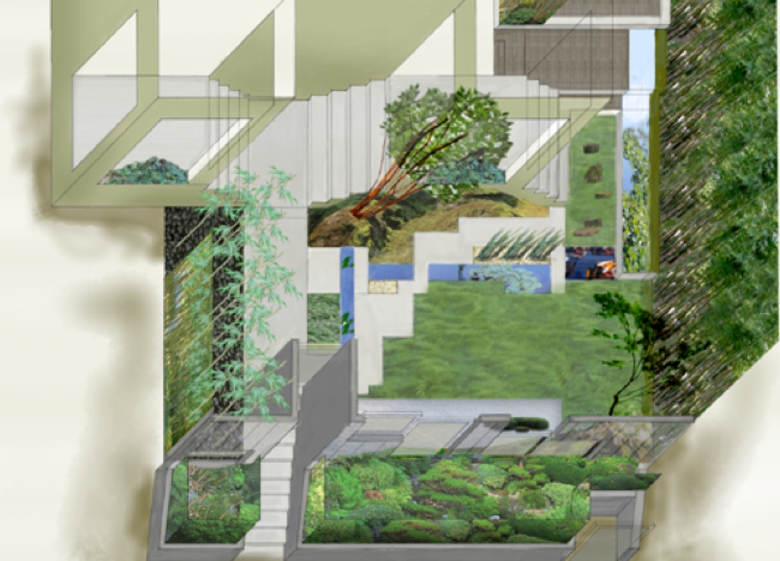 A composition of hedging, raked gravel, creeping red fescue, and geometric paving draw the eye to the outdoor living areas located on the side of the duplex.