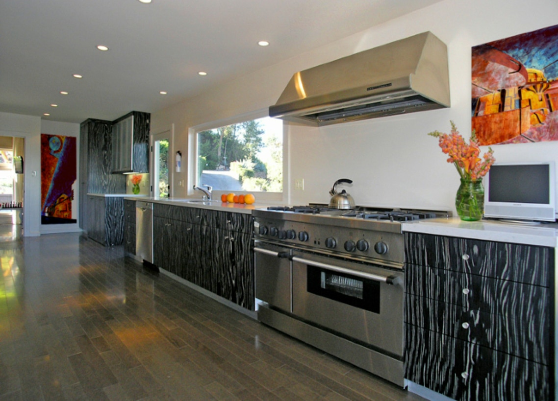 The modern European style kitchen features figured, black drawer and cabinet fronts, sleek stainless steel appliances and a long composite countertop.