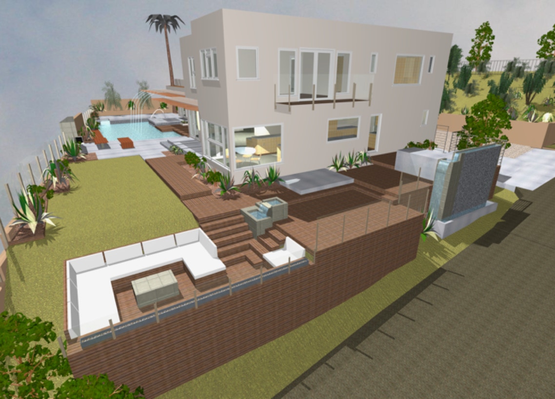 As depicted by this rendering of hardscape features, a new outdoor lounge area will be integrated into a previously unusable area facing Stone Canyon lake; water features throughout the design will act as modern equivalents of medieval plaza fountains, providing cooling during the hot weather.