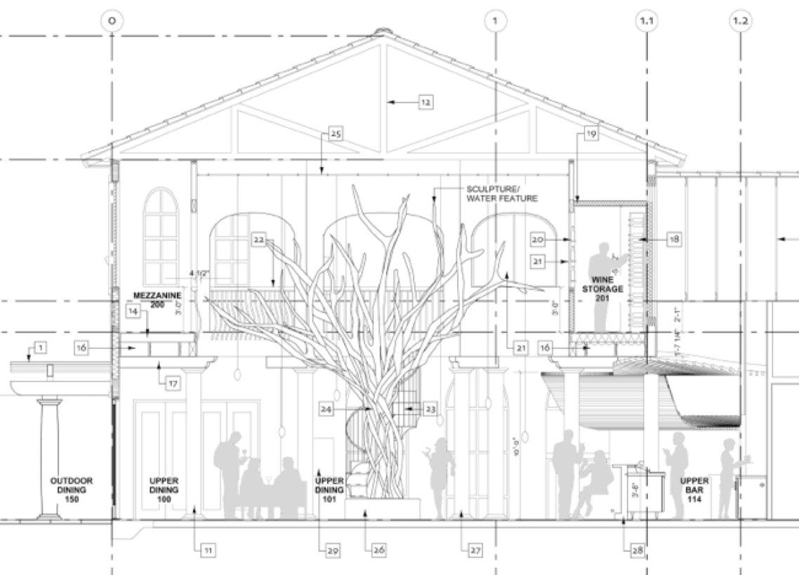 A 22-foot tall metal and glass sculpture – an abstract of an olive tree – is the central visual in the vaulted atrium.