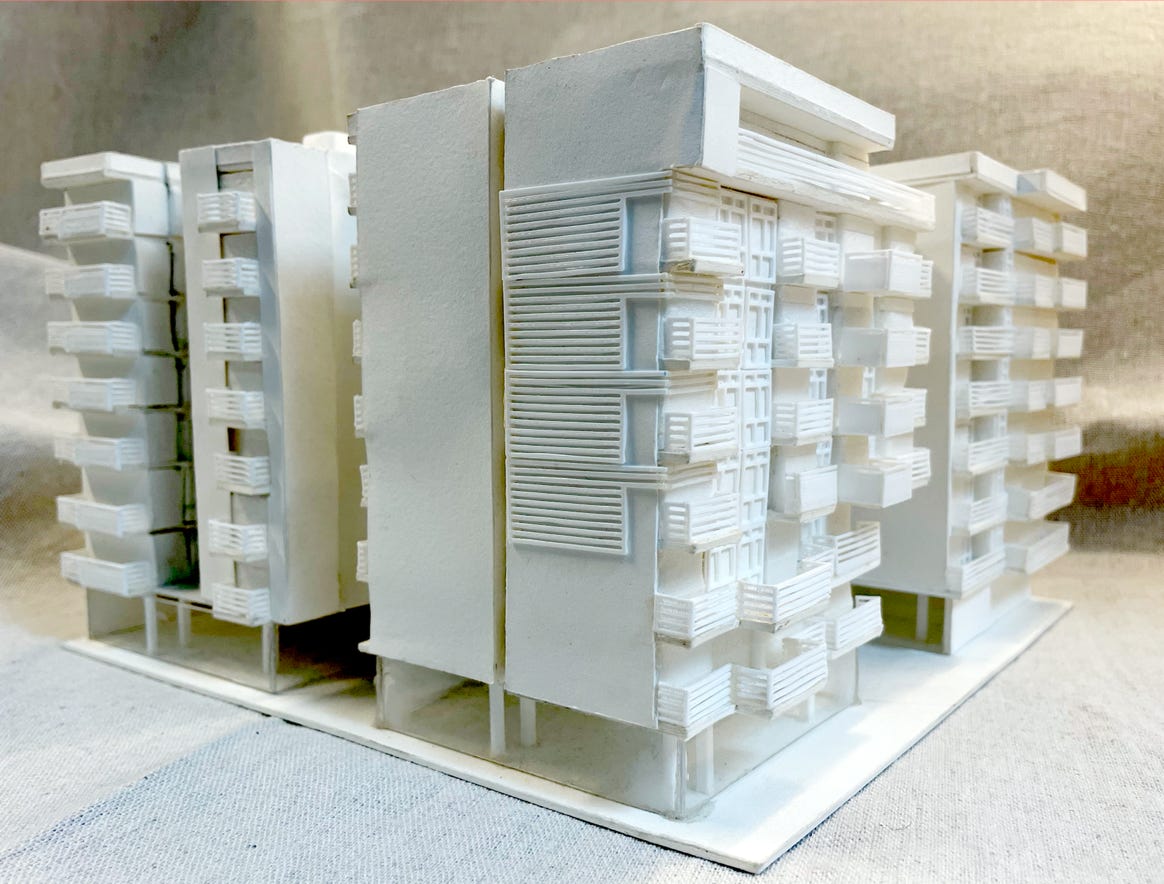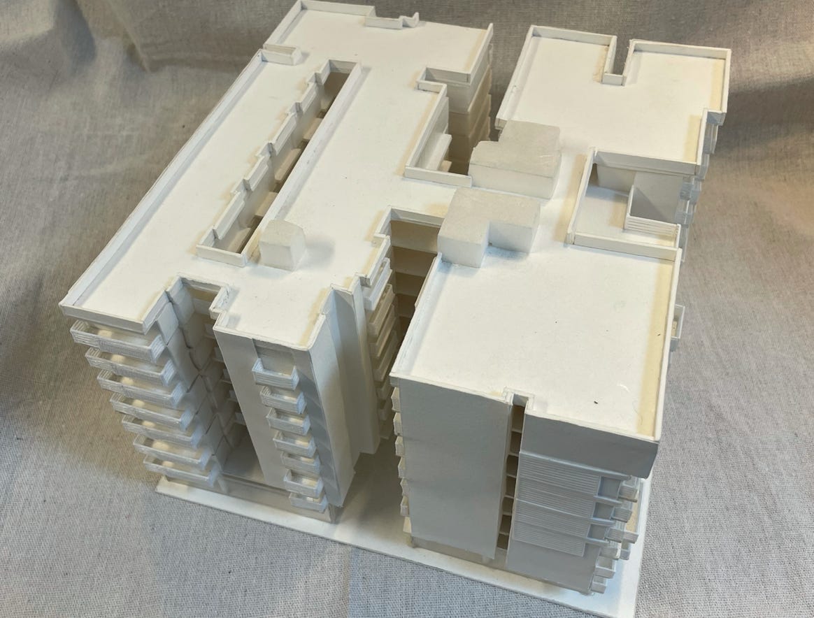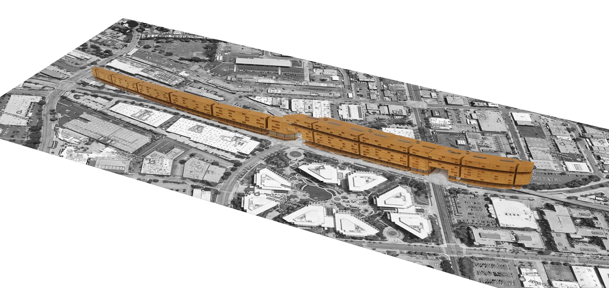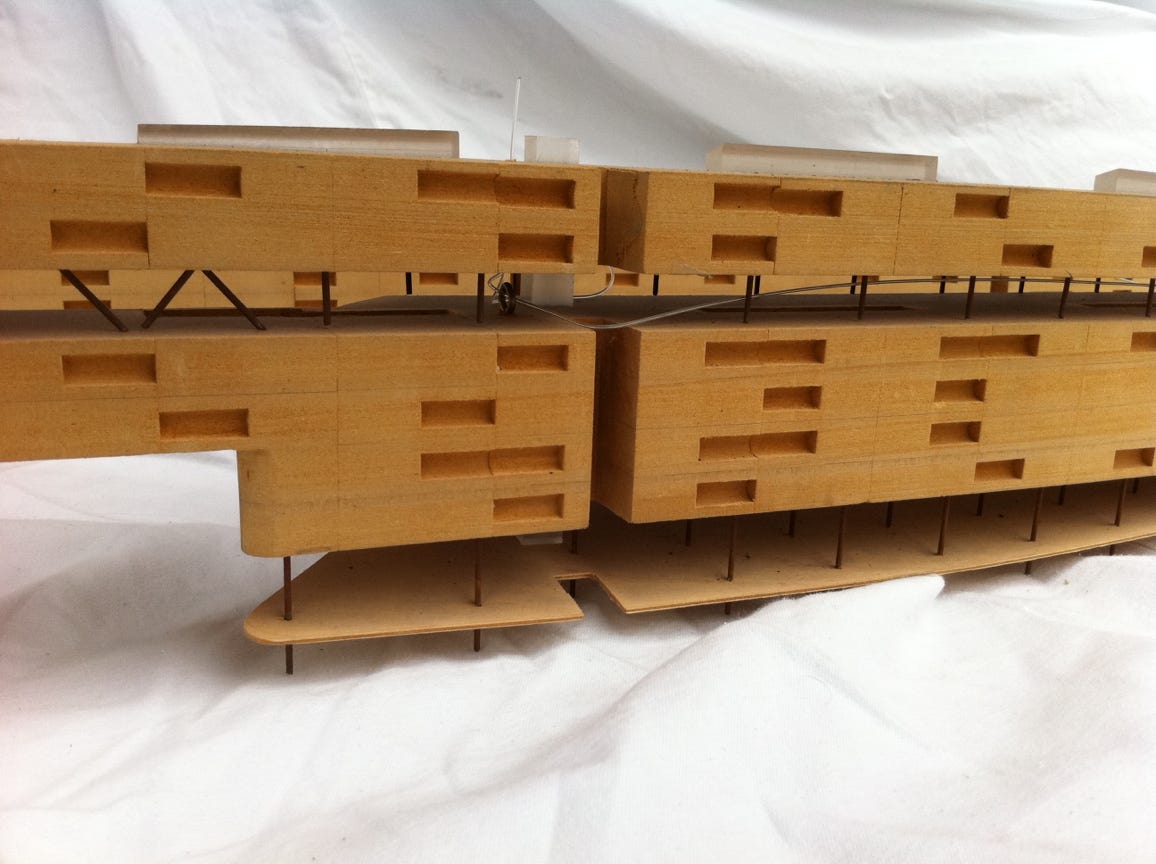 “Exposition Housing” 10 feet long x 6" x 6”h 8-story residential, 1/4 mile long, with underpasses.