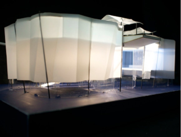 Foam core (blue), acrylic, wire, mylar, museum board. Articulated marquee.